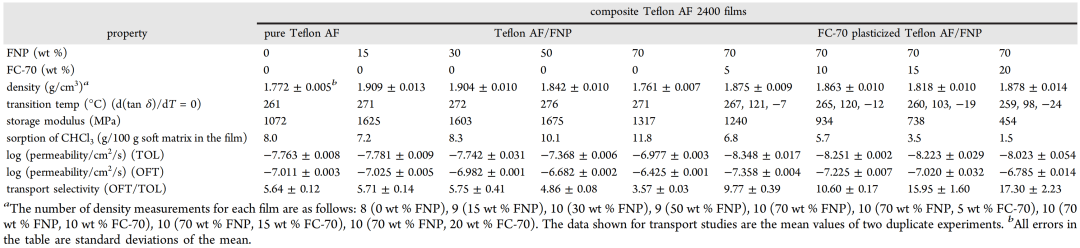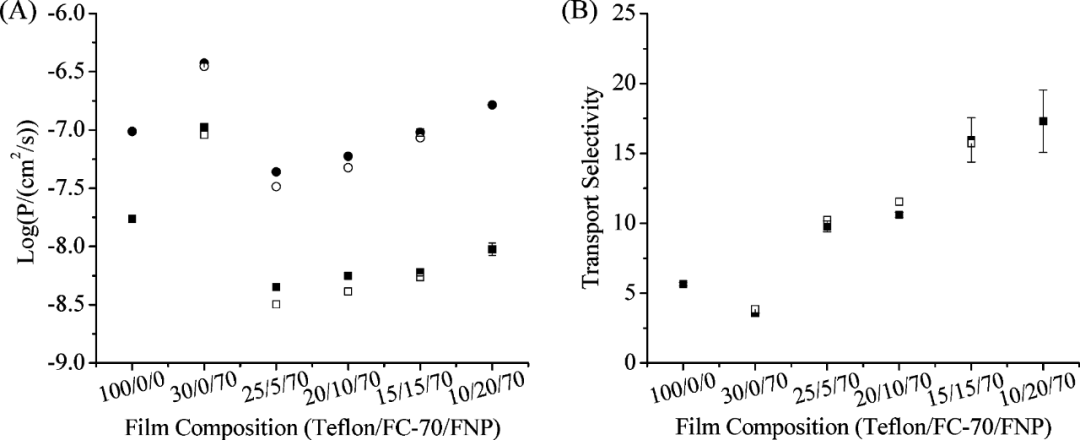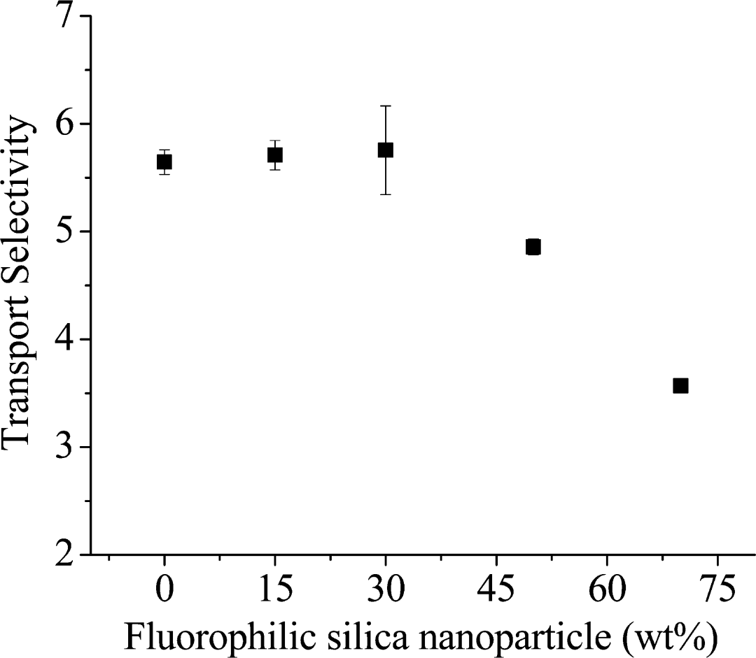 纳米复合材料系统的传输选择性是否可以提高?受我们之前对 Teflon AF 2400/FC-70 复合薄膜研究的启发,我们假设通过使用 FC-70 增塑 Teflon AF 作为纳米复合薄膜中的软材料,可以实现纳米复合 Teflon AF 薄膜的高传输选择性。如图 4S(支持信息)所示,这些复合薄膜尺寸稳定且均匀。与玻璃状 Teflon AF 复合薄膜相比,它们表现出非常不同的行为。