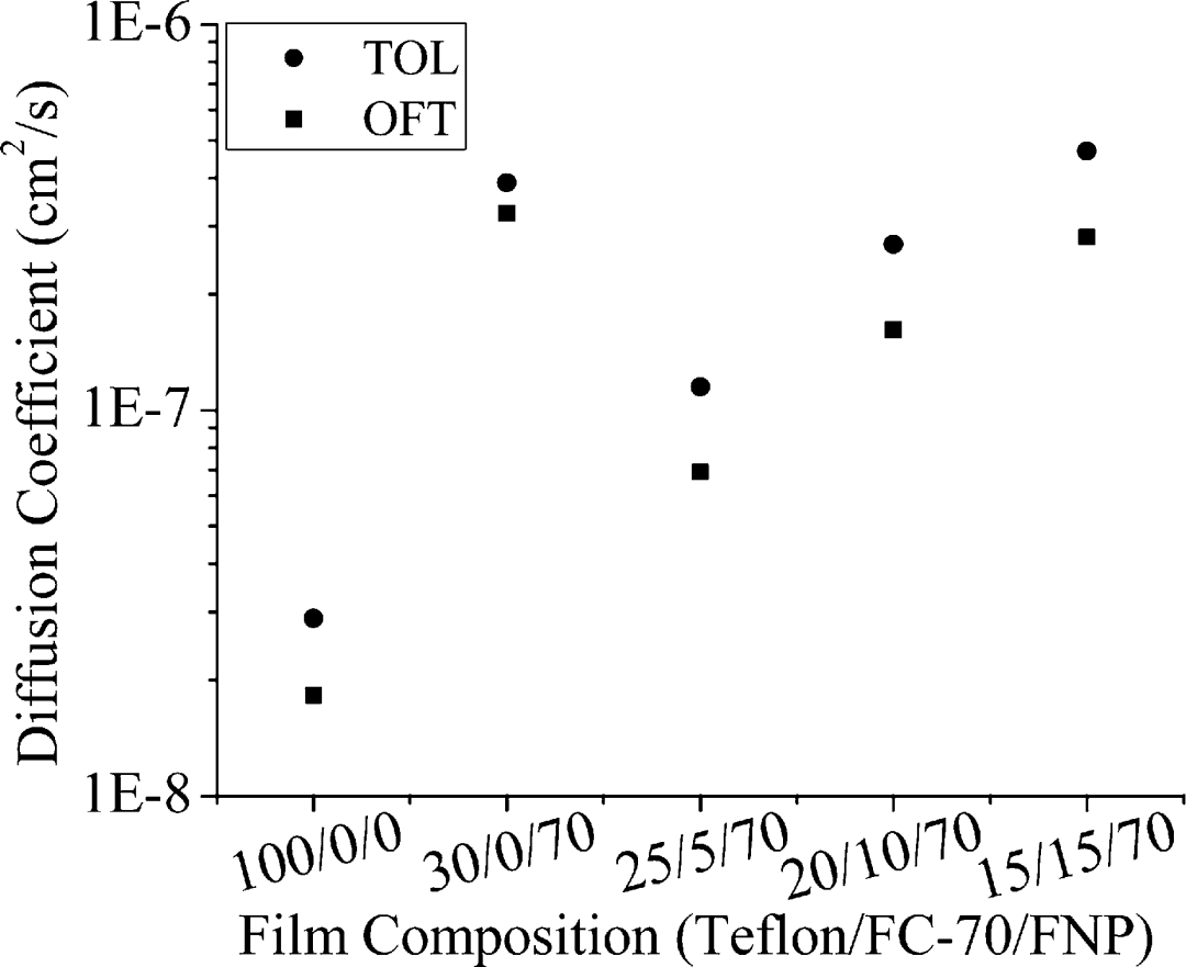 三组分薄膜非常出色。以低迁移率 FNP 作为骨架,由 FC-70 增塑的 Teflon AF 2400 制成的机械强度高的纳米复合薄膜表现出低氯仿吸附性。事实上,如上所述,氯仿吸附量远低于单独使用 Teflon AF 或 FC-70 时的吸附量。这些薄膜在不牺牲渗透率的情况下表现出前所未有的高 OFT/TOL 传输选择性。根据早期的工作,我们知道单组分 Teflon AF 2400 薄膜对非极性芳香烃的渗透性随着烃分子量的增加而降低。当添加极性官能团(例如硝基苯、苯甲酸)时,渗透率进一步降低,但随着用 F− 代替 H−,渗透率增加。然而,在单组分薄膜中,含氟化合物相对于含氢化合物的传输选择性不如相同溶质从 CHCl3 到 FC-70 的分配选择性高。这里描述的三组分薄膜具有非常好的分配选择性,仅比 CHCl3 到 FC-70 差约 2 倍(图 8),并且扩散系数比单组分薄膜高。 因此,三组分膜非常适合选择性传输含氟物质或与嵌入的分子受体互补的分析物。
