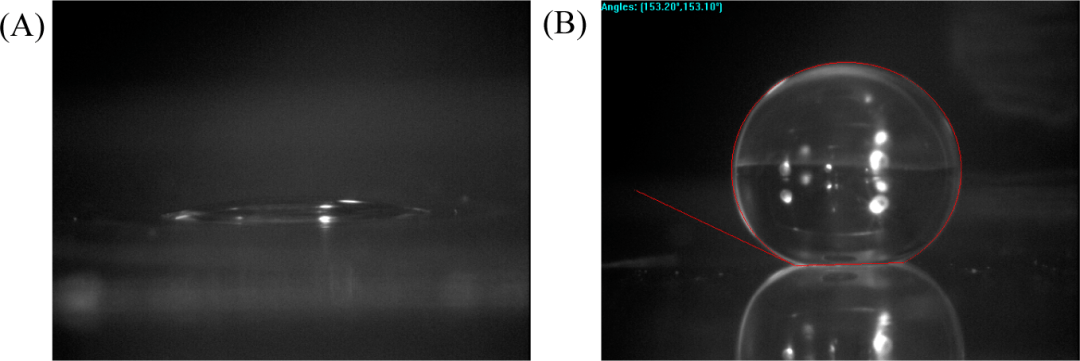图 1. (A) 显微镜载玻片上未改性二氧化硅纳米颗粒的水接触角; (B) 显微镜载玻片上氟烷基硅烷改性二氧化硅纳米粒子的水接触角。