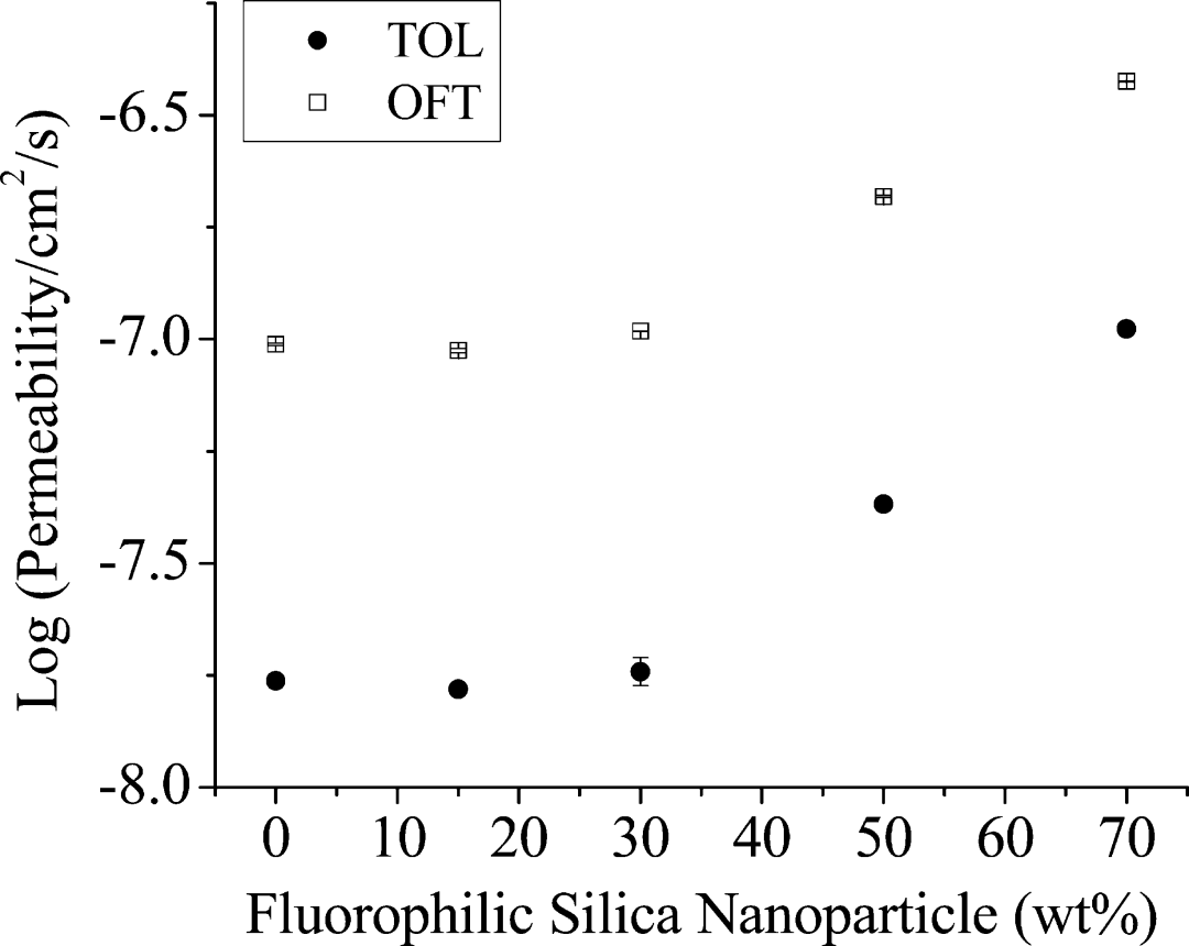 图 4 显示了甲苯 (TOL) 和八氟甲苯 (OFT) 通过 FNP 掺杂的 Teflon AF 2400 薄膜的渗透系数的对数。两种探针溶质相对于 FNP 的重量百分比显示出相似的趋势。当FNP含量大于30wt%时,随着纳米粒子含量的增加,观察到P的显着增加。例如,八氟甲苯通过 70 wt % 掺杂 FNP 的Teflon AF 2400 薄膜的渗透率是通过纯Teflon AF 薄膜的 3.9 倍,而其对应碳氢化合物(甲苯)通过 70 wt % 掺杂 FNP 的薄膜的渗透率是通过纯特氟龙 AF 薄膜的 6.1 倍。