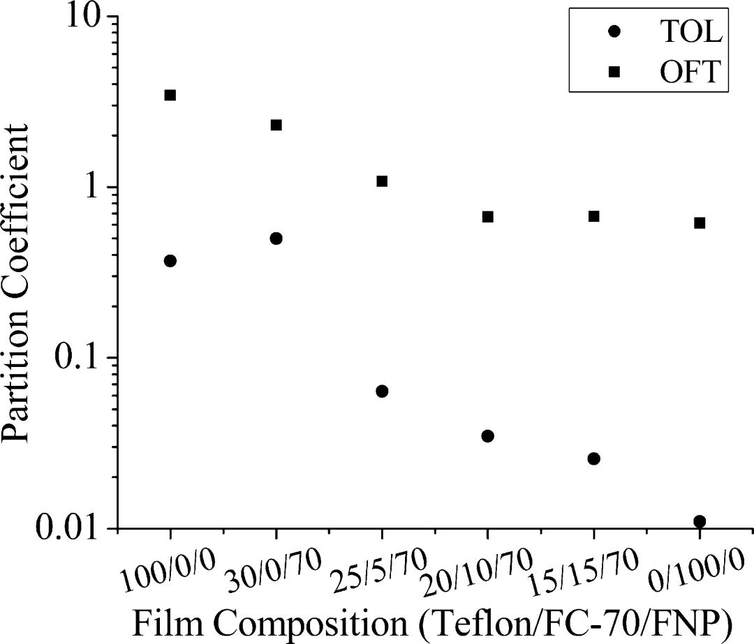相比之下(图8),TOL 和OFT 的CHCl3/软矩阵分配系数均随着FC-70 比例的增加而降低,但OFT 分配系数降低较少。在含有 5 wt% FC-70 的三组分薄膜中,OFT 对 TOL 的分配选择性为 17,与具有相同 FC-70/Teflon AF 质量比的散装 Teflon AF/FC-70 体系中的值相似。随着 FC-70 含量的增加,从氯仿到纯 FC-70 的分配系数逐渐接近其值。三组分薄膜在分配过程中就像支撑液膜一样,与纯 Teflon AF 薄膜相比,传输选择性显着提高(表 1,图 6B)。10 wt% Teflon AF 2400/70 wt% FNP/20 wt% FC-70 薄膜的 OFT/TOL 渗透率比为 17.3,是纯 Teflon AF 2400 薄膜的 3.1 倍。鉴于热稳定性和尺寸稳定性以及氟液体性质,增塑的Teflon AF纳米复合材料与分子受体结合后可能成为固相微萃取涂层的理想材料。
