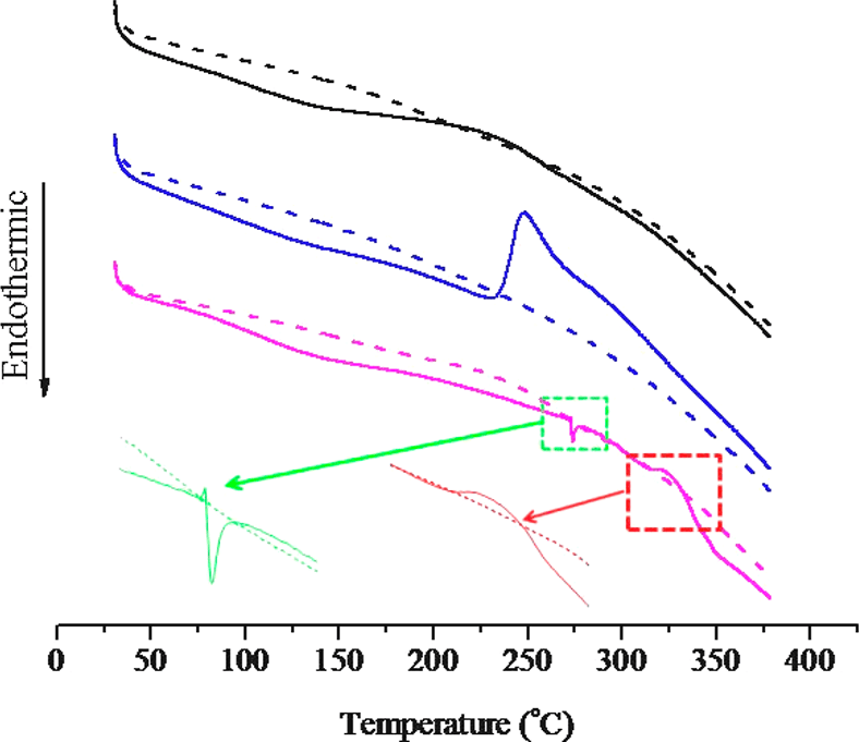 图 3. 未改性(黑线)、辛基硅烷改性(蓝线)和氟烷基硅烷改性(洋红色线)二氧化硅纳米颗粒的 DSC 曲线。 实线表示第一加热循环,虚线表示第二加热循环。
