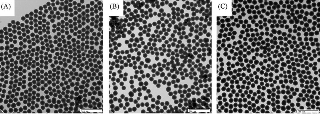 图 2. 二氧化硅纳米颗粒的 TEM 显微照片: (A) 未修饰;(B) 氟烷基硅烷修饰;(C) 辛基硅烷修饰(比例尺 = 500nm)。图像分析软件(Simple PCI 6)会手动识别明显重叠的颗粒,将其排除在分析之外。