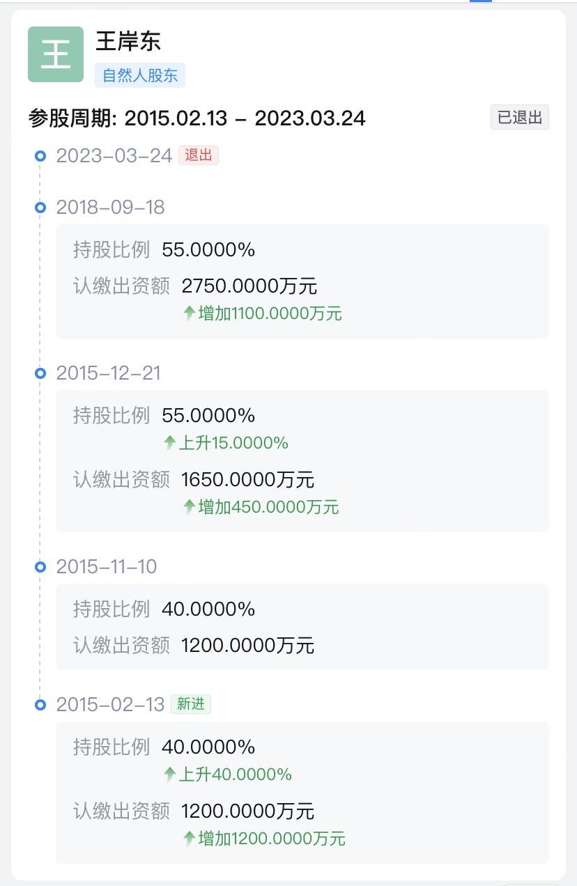 天眼查显示,悦海公司的历史高管中曾出现过王岸东的名字。他在2015年2月为悦海公司股东,当时悦海公司注册资本为3000万元,他认缴出资1200万元,持股40%。直至2018年9月,王岸东认缴出资2750万元,持股55%,后在2023年3月退出持股。